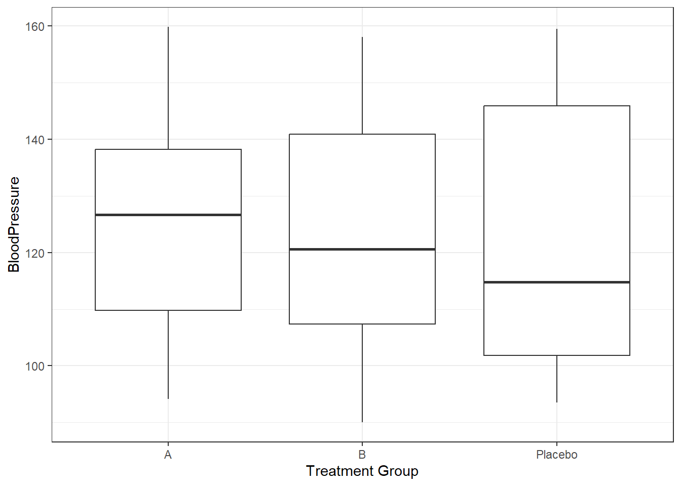 # ggplot2 boxplot for blood pressure by treatment groupggplot(syn_dat, aes(x = TreatmentGroup, y = BloodPressure)) +geom_boxplot() +labs(x ="Treatment Group", y ="BloodPressure") +theme_bw()