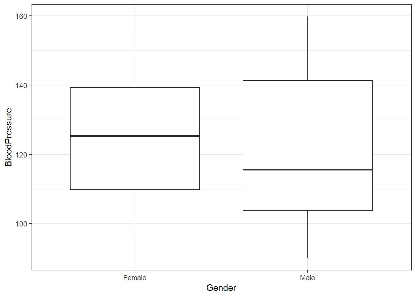 # ggplot2 boxplot for blood pressure by genderggplot(syn_dat, aes(x = Gender, y = BloodPressure)) +geom_boxplot() +labs(x ="Gender", y ="BloodPressure") +theme_bw()