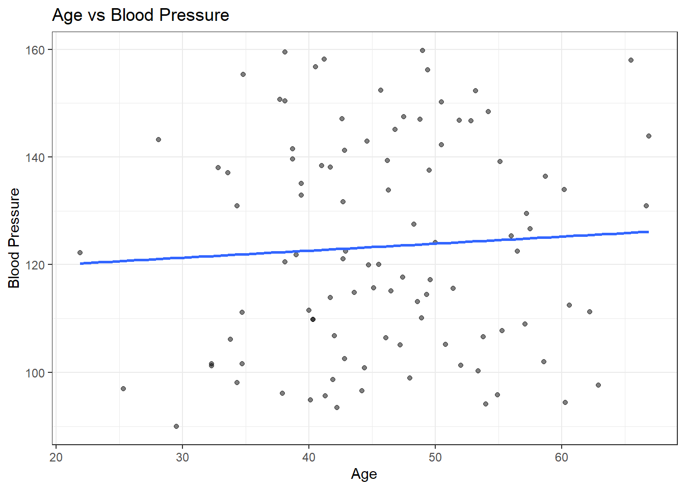 #ggplot2 scatterplot for blood pressure by ageggplot(syn_dat, aes(x = Age, y = BloodPressure)) +geom_point(alpha =0.5) +geom_smooth(method ="lm", se =FALSE) +labs(title ="Age vs Blood Pressure",x ="Age",y ="Blood Pressure" ) +theme_bw()