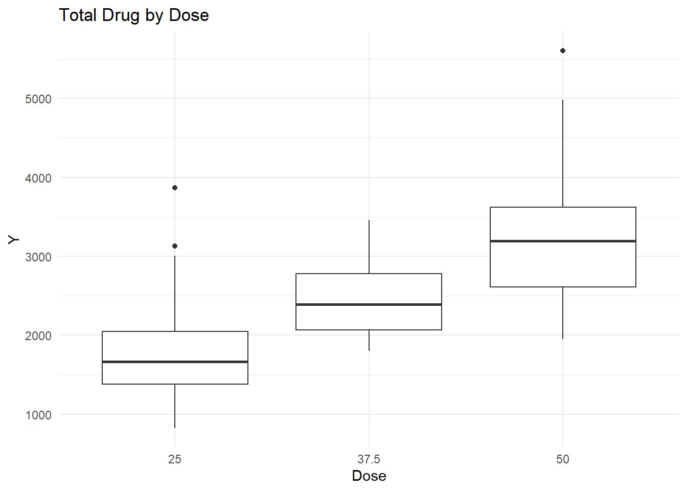 ggplot(clean_data, aes(x =factor(DOSE), y = Y)) +geom_boxplot() +theme_minimal() +labs(title ="Total Drug by Dose", x ="Dose")