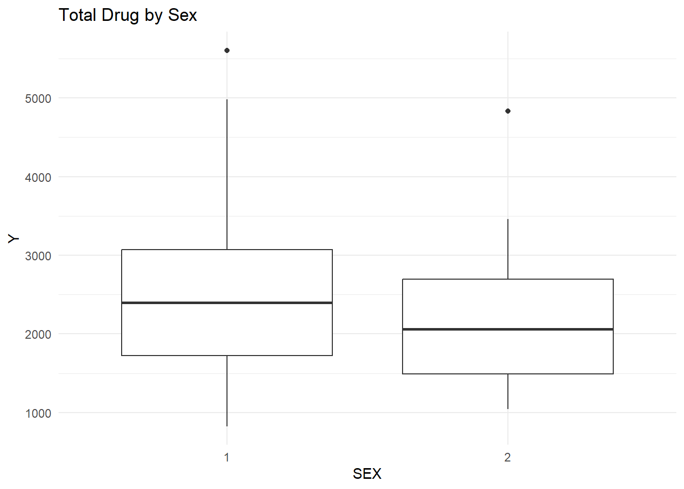 The boxplot comparing total drug exposure (Y) across sex groups shows that individuals coded as sex = 1 have a slightly higher median exposure than those coded as sex = 2.