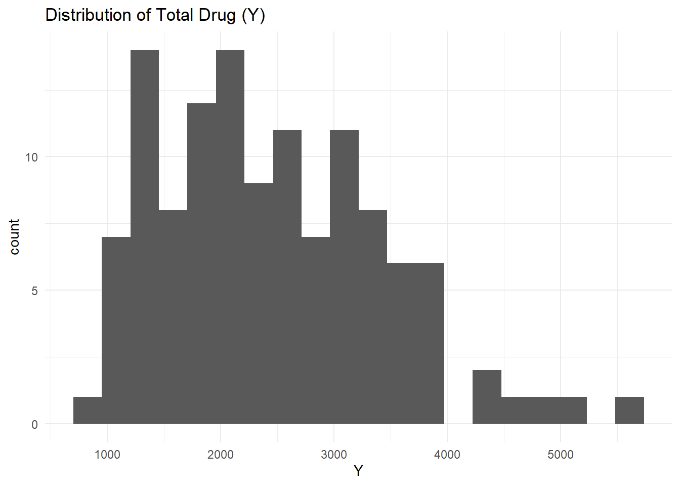 ggplot(clean_data, aes(x = Y)) +geom_histogram(bins =20) +theme_minimal() +labs(title ="Distribution of Total Drug (Y)")