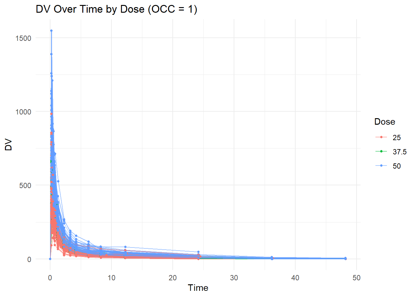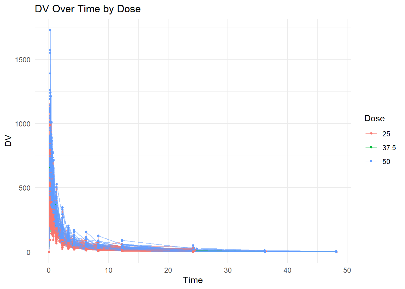 ggplot(mavoglurant, aes(x = TIME, y = DV, group = ID, color =factor(DOSE))) +geom_line(alpha =0.6) +geom_point(size =1) +labs(title ="DV Over Time by Dose",x ="Time",y ="DV",color ="Dose" ) +theme_minimal()