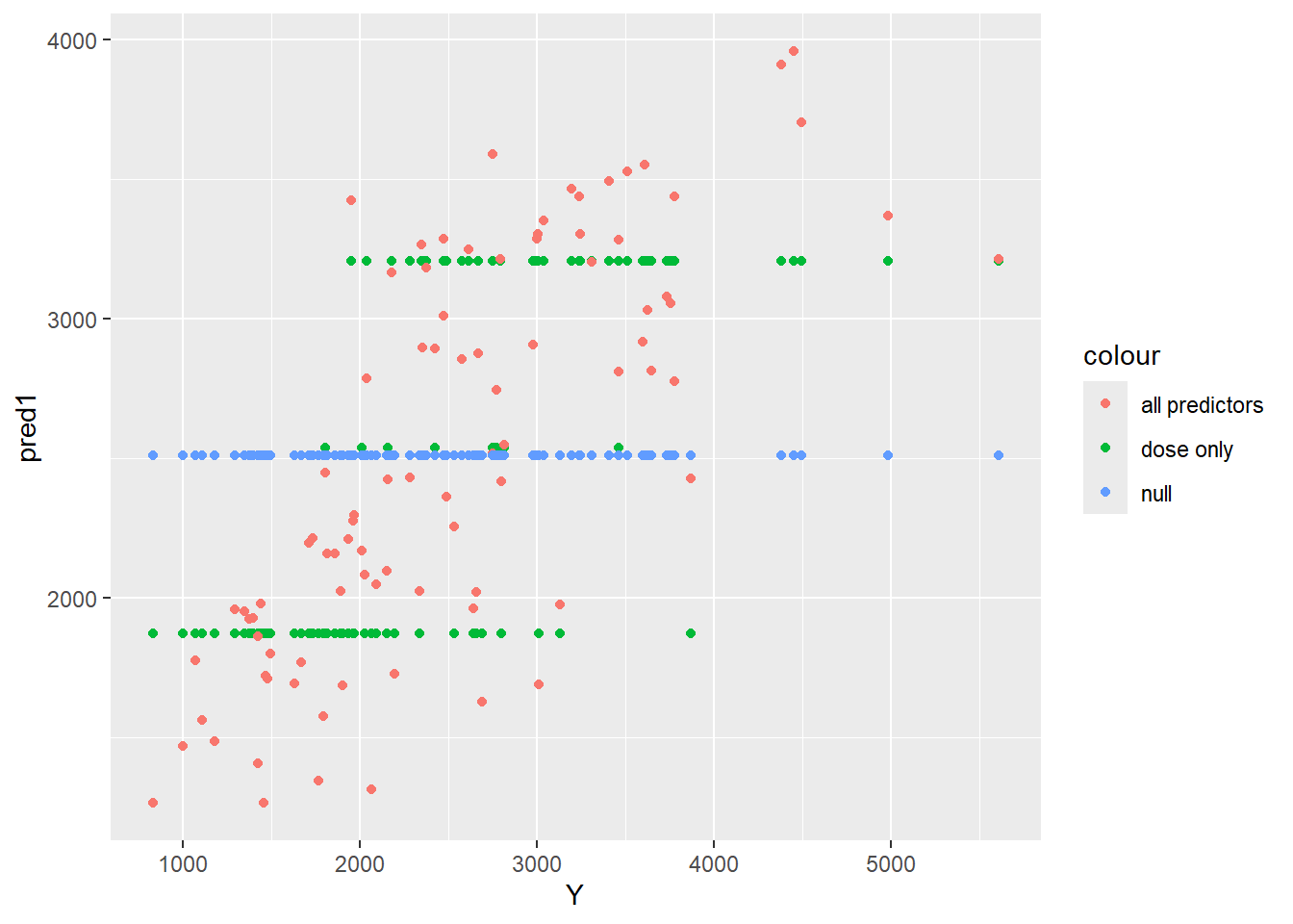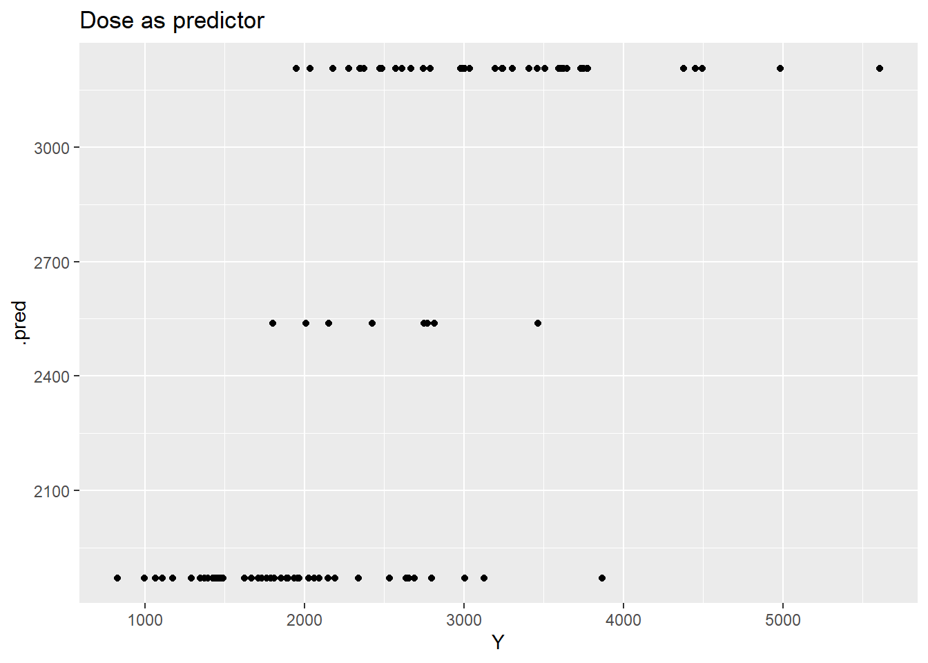 p1 <- pred1 %>%ggplot(aes(x=Y, y=.pred)) +geom_point() +ggtitle("Dose as predictor")p1