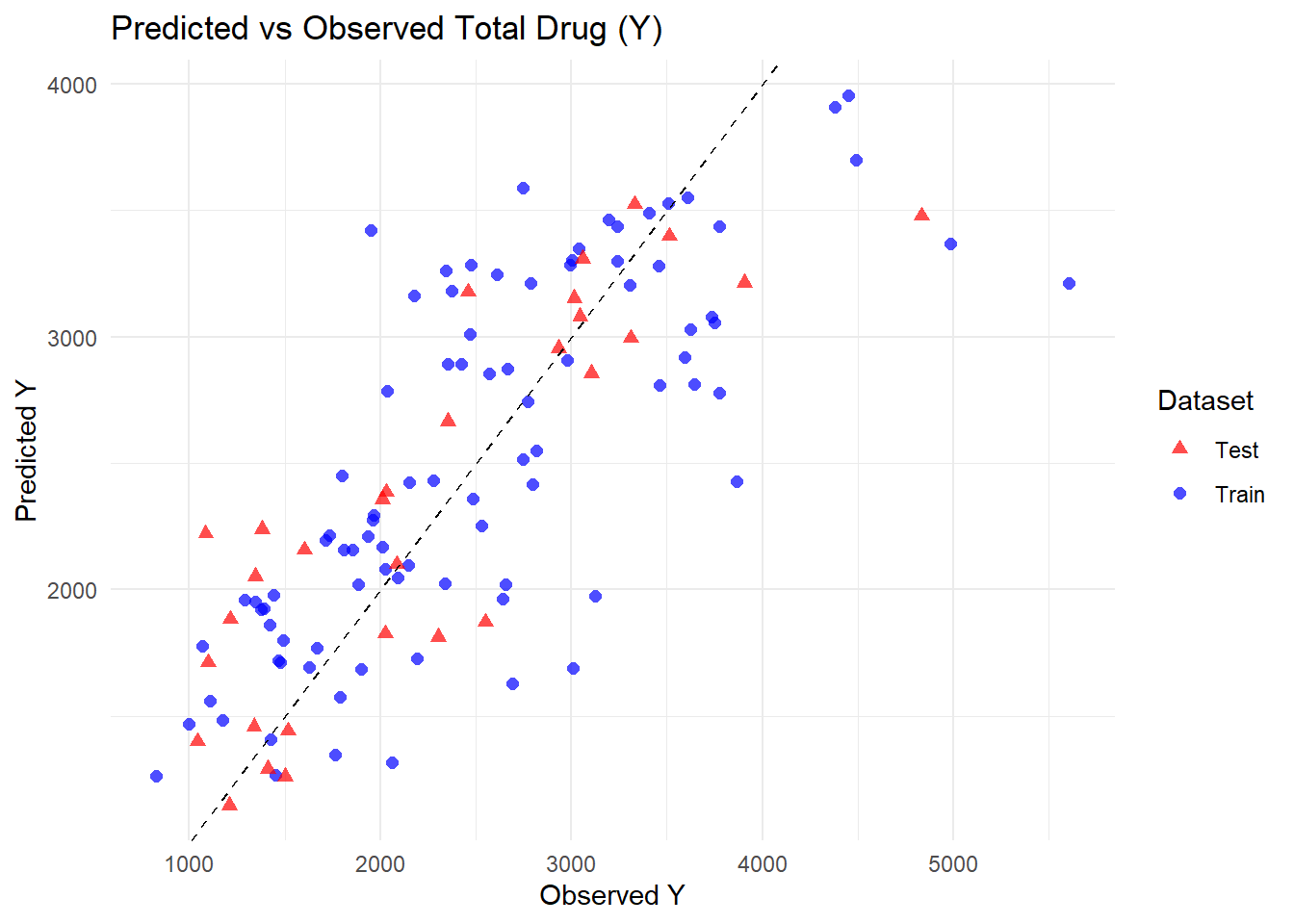 pred_test <-predict(fit_model2, test_data) %>%bind_cols(test_data) %>%mutate(dataset ="Test")pred_train <- pred2 %>%mutate(dataset ="Train")# Combine train and test predictionspred_all <-bind_rows(pred_train, pred_test)# Plot predicted vs observed for both datasetsggplot(pred_all, aes(x = Y, y = .pred, color = dataset, shape = dataset)) +geom_point(size =2, alpha =0.7) +geom_abline(slope =1, intercept =0, linetype ="dashed") +labs(title ="Predicted vs Observed Total Drug (Y)",x ="Observed Y",y ="Predicted Y",color ="Dataset",shape ="Dataset" ) +theme_minimal() +scale_color_manual(values =c("Train"="blue", "Test"="red")) +scale_shape_manual(values =c("Train"=16, "Test"=17))