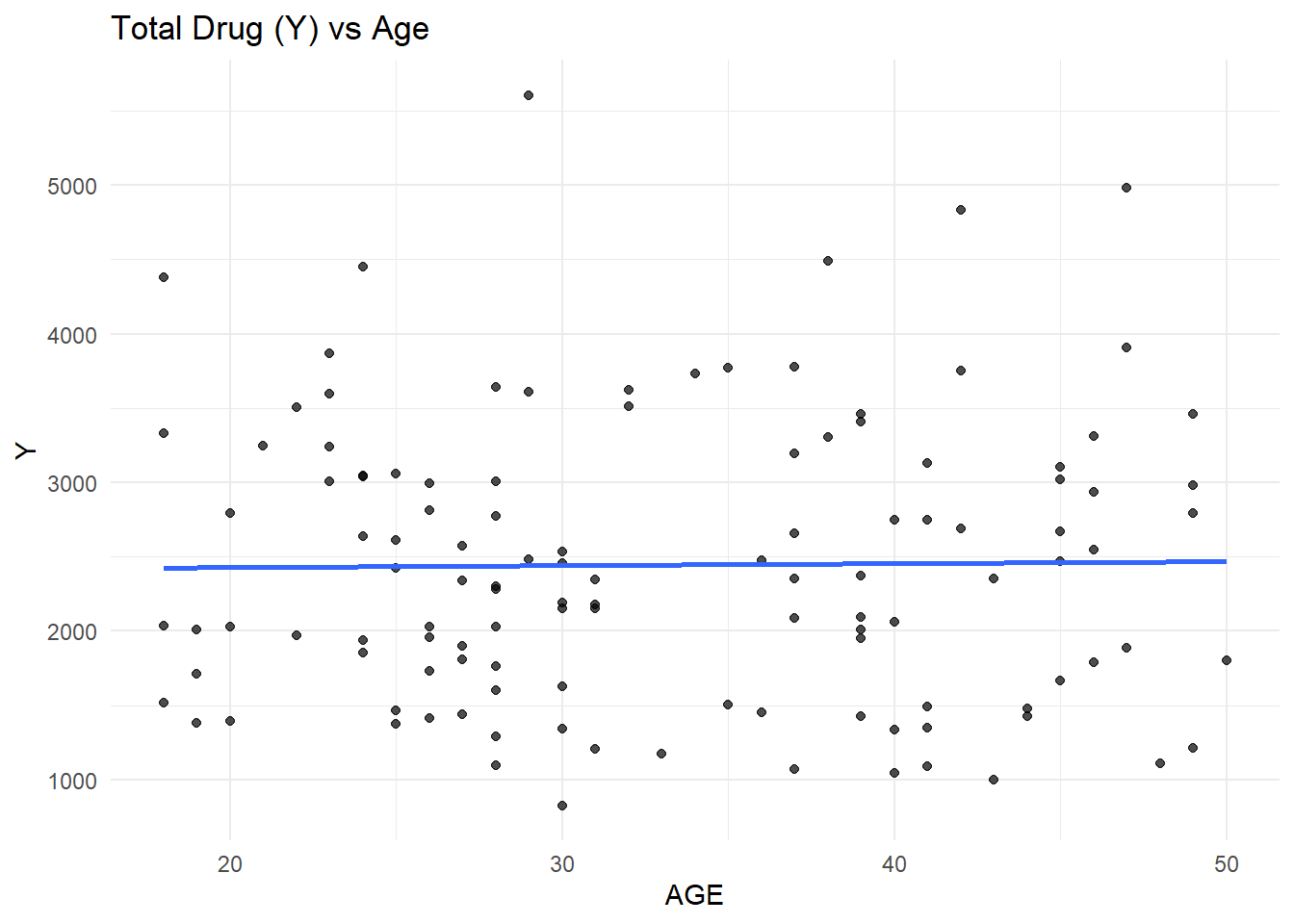 ggplot(clean_data, aes(x = AGE, y = Y)) +geom_point(alpha =0.7) +geom_smooth(method ="lm", se =FALSE) +theme_minimal() +labs(title ="Total Drug (Y) vs Age")