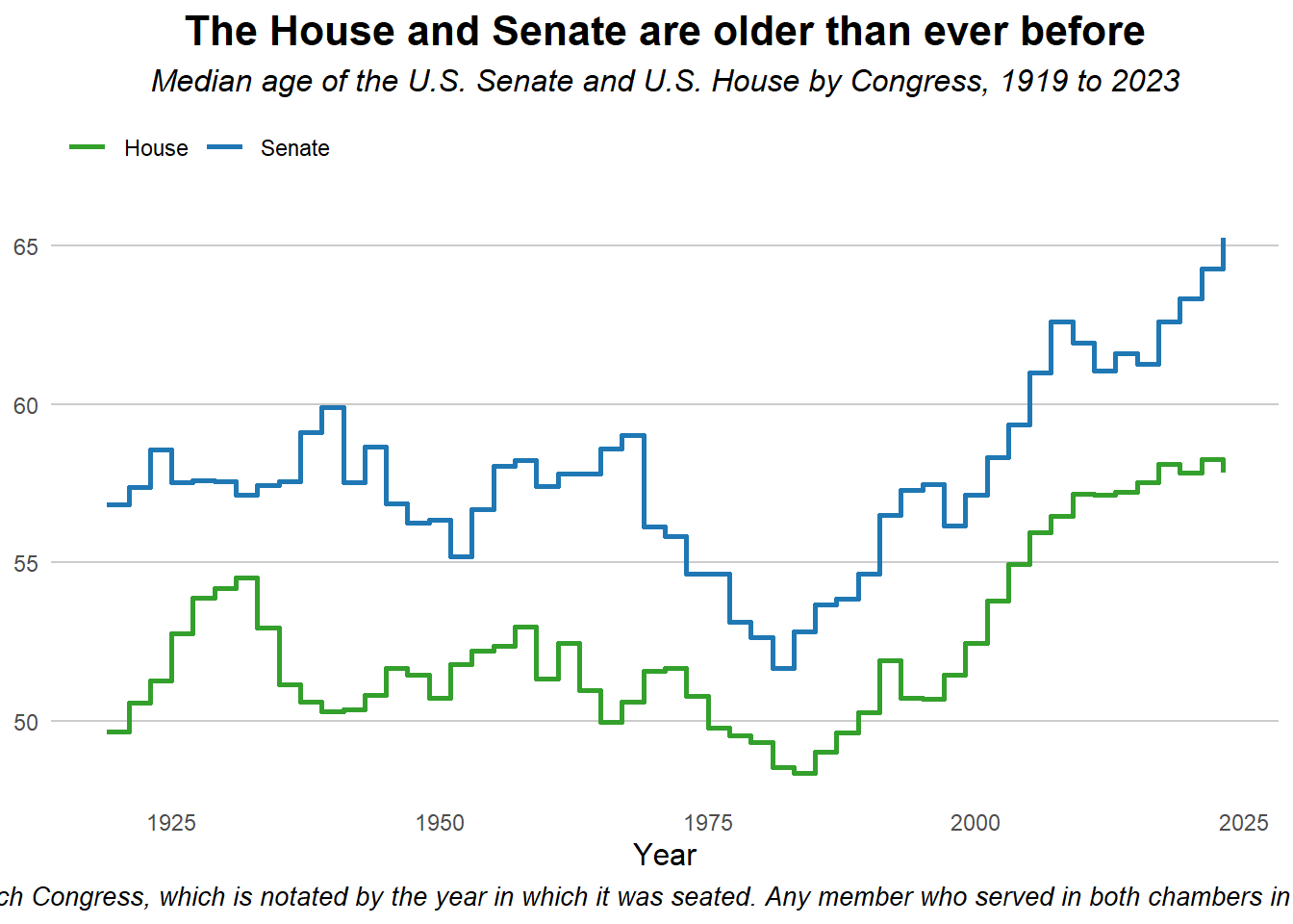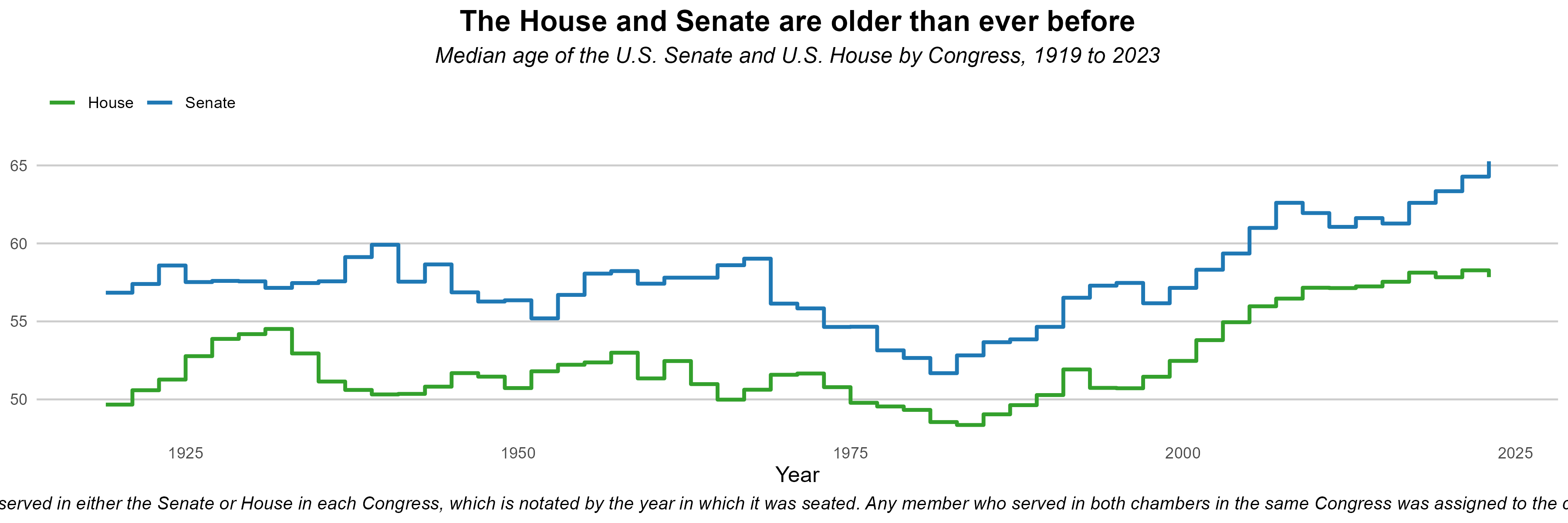 # Filter for odd-numbered yearsmedian_age_odd_years <- median_age_data %>%filter(year %%2==1) # Keep only years where year mod 2 = 1 (odd)# Step plotggplot(median_age_odd_years, aes(x = year, y = median_age, color = chamber)) +geom_step(linewidth =1, direction ="hv") +# "hv" makes horizontal then vertical steps#geom_point(size = 2) + labs(title ="The House and Senate are older than ever before",subtitle ="Median age of the U.S. Senate and U.S. House by Congress, 1919 to 2023",x ="Year",y =NULL, color =NULL,caption ="Data is based on all members who served in either the Senate or House in each Congress, which is notated by the year in which it was seated. Any member who served in both chambers in the same Congress was assigned to the chamber in which they cast more votes." ) +scale_color_manual(values =c("House"="#33a02c", "Senate"="#1f78b4")) +theme_minimal() +theme(plot.title =element_text(size =16, face ="bold", hjust =0.5),plot.subtitle =element_text(size =12, face ="italic", hjust =0.5),plot.caption =element_text(size =10, face ="italic", hjust =0.5),axis.title.y =element_blank(),axis.title.x =element_text(size =12),panel.grid.major.x =element_blank(),panel.grid.minor.x =element_blank(),panel.grid.major.y =element_line(color ="grey80"),panel.grid.minor.y =element_blank(),legend.position ="top", # place legend above the plotlegend.justification ="left", # align legend to leftlegend.background =element_rect(fill ="transparent", color =NA), # transparent boxlegend.key =element_rect(fill ="transparent", color =NA) # transparent keys )