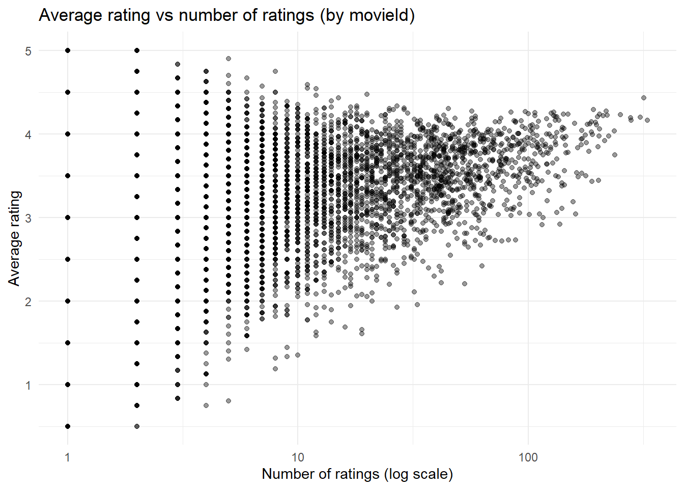 # Plot average rating vs number of ratingsggplot(movie_summary, aes(x = n_ratings, y = avg_rating)) +geom_point(alpha =0.4) +scale_x_log10() +labs(title ="Average rating vs number of ratings (by movieId)",x ="Number of ratings (log scale)",y ="Average rating" ) +theme_minimal()
