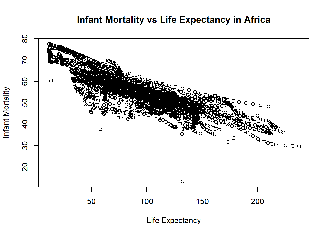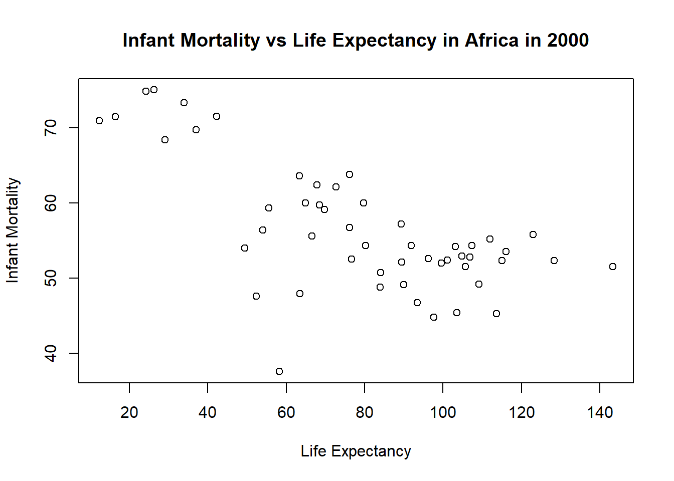 #Plotting life expectancy as a function of infant mortality#using the plot function to make the plot and assigning it to a variable named "plot1"plot1 <-plot( #takes the infant_mortality column from africa_infant_mortality and makes it the x-axis values africa_infant_mortality$infant_mortality, #takes the life expactancy column from africa_infant_mortality and makes it the y-axis values africa_infant_mortality$life_expectancy, xlab ="Life Expectancy", #labels the x-axis "Life Expectancy"ylab ="Infant Mortality", #labels the y-axis "Infant Mortality"#titles the whole plot "Infant Mortality vs Life Expectancy in Africa"main ="Infant Mortality vs Life Expectancy in Africa")