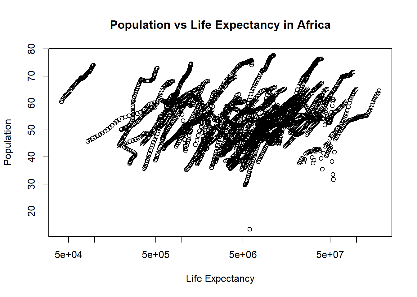 #Plotting life expectancy as a function of population#using the plot function to make the plot and assigning it to a variable named "plot2"plot2 <-plot( #takes the population column from africa_pop and makes it the x-axis values africa_pop$population, #takes the life expactancy column from africa_pop and makes it the y-axis values africa_pop$life_expectancy, xlab ="Life Expectancy", #labels the x-axis "Life Expectancy"ylab ="Population", #labels the y-axis "Population"#titles the whole plot "Population vs Life Expectancy in Africa"main ="Population vs Life Expectancy in Africa",log ="x"#sets the scale of the x-axis to be logarithmic)