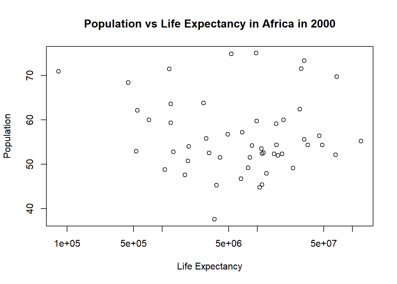 #Plotting life expectancy as a function of population#using the plot function to make the plot and assigning it to a variable named "plot4"plot4 <-plot( #takes the population column from africa_2000 and makes it the x-axis values africa_2000$population, #takes the life expactancy column from africa_2000 and makes it the y-axis values africa_2000$life_expectancy, xlab ="Life Expectancy", #labels the x-axis "Life Expectancy"ylab ="Population", #labels the y-axis "Population"#titles the whole plot "Population vs Life Expectancy in Africa in 2000"main ="Population vs Life Expectancy in Africa in 2000", log ="x"#sets the scale of the x-axis to be logarithmic)